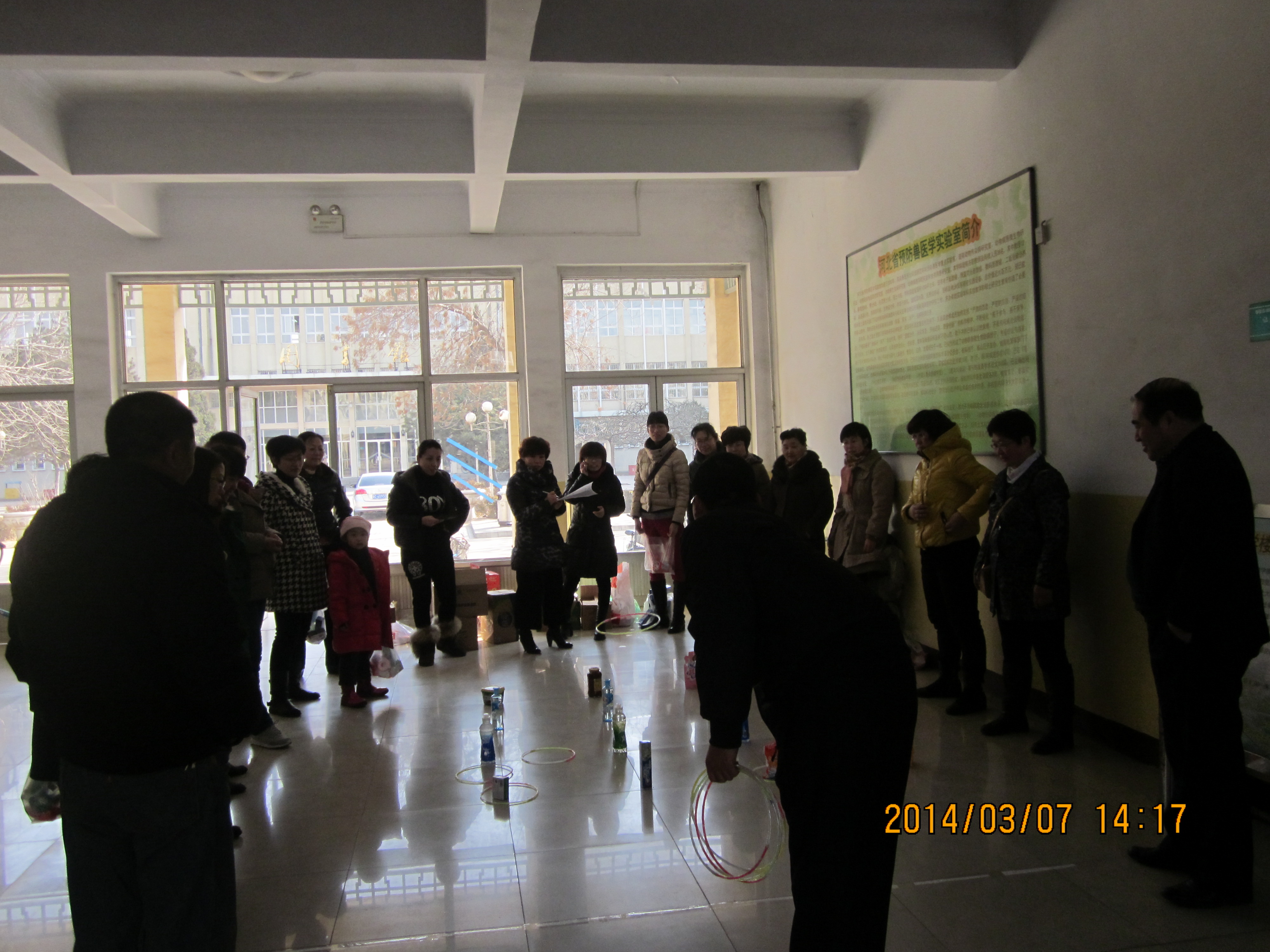 2014年3月7日太阳成tyc122cc集团在动科楼一楼大厅举办了庆三八趣味套圈活动。本次套圈活动给每个教职工发放套圈的圈10个,站在套圈起止线外套,套中哪排奖品就到领奖处领取哪个等次的奖品,奖品共分为类,第一排的价值最低,难度也最低,离着起止线最近,以此类推最后一排离着起止线最远,奖品价值也最高。男教工在本次活动中参与的积极性也较高,他们的起止线比女教工远了一些,但是命中大奖率还是比较高,大家在套圈的过程中时不时发出开心得笑声,套不住的给予鼓励,套进大奖时大家齐鼓掌庆祝,气氛十分热烈,大家都开开心的度过这个三八节日,每人得到的奖品也非常丰厚,最多的能命中7圈,收获不小。