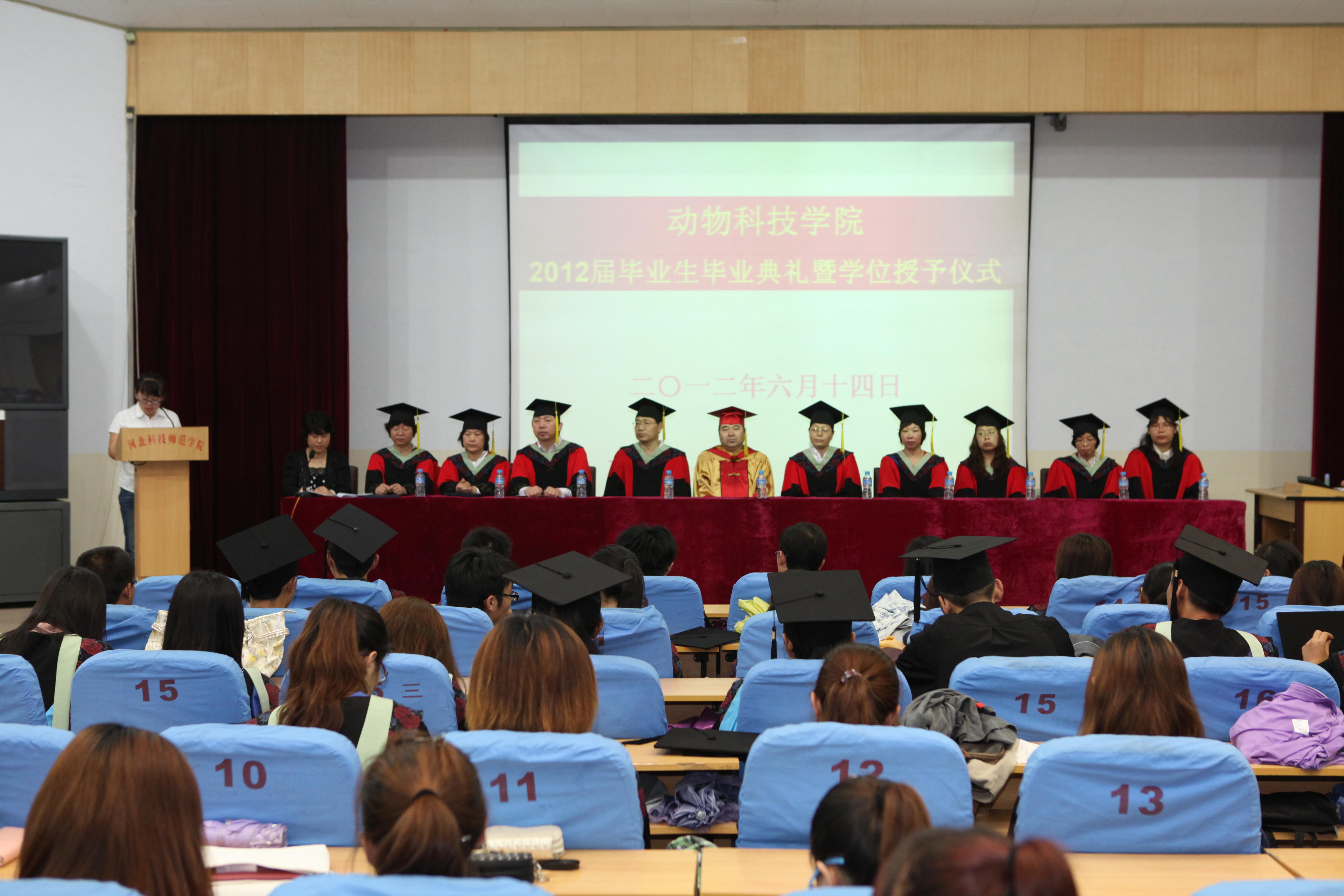 2012年6月14日上午,“太阳成tyc122cc集团2012届毕业典礼暨学士学位授予仪式”在昌黎校区学术报告厅举行。太阳成tyc122cc集团学位委员会主任吴建华教授、导师、任课教师出席仪式,全体毕业生身着学位服参加本次仪式。动物科技公司党委副书记王玉芬同志主持仪式。她宣读了辛彦怀董事长委托吴建华教授授予学士学位的委托书。公司党委书记段立华同志宣读了《关于授予2012届优秀毕业生的表彰决定》,副经理杨宗泽教授宣读了太阳成tyc122cc集团学位评定委员会《关于授予陈丹朔等229人学士学位的决定》,并代表公司向同学们表示衷心的祝贺。在神圣愉快的乐曲声中,公司学位评定委员会全体委员共同为到场的所有学士学位获得者颁发学位证书,正冠拨苏并合影留念。整个授予仪式气氛隆重而热烈,同学们怀着激动的心情,井然有序地列队登上主席台接受学位证书。