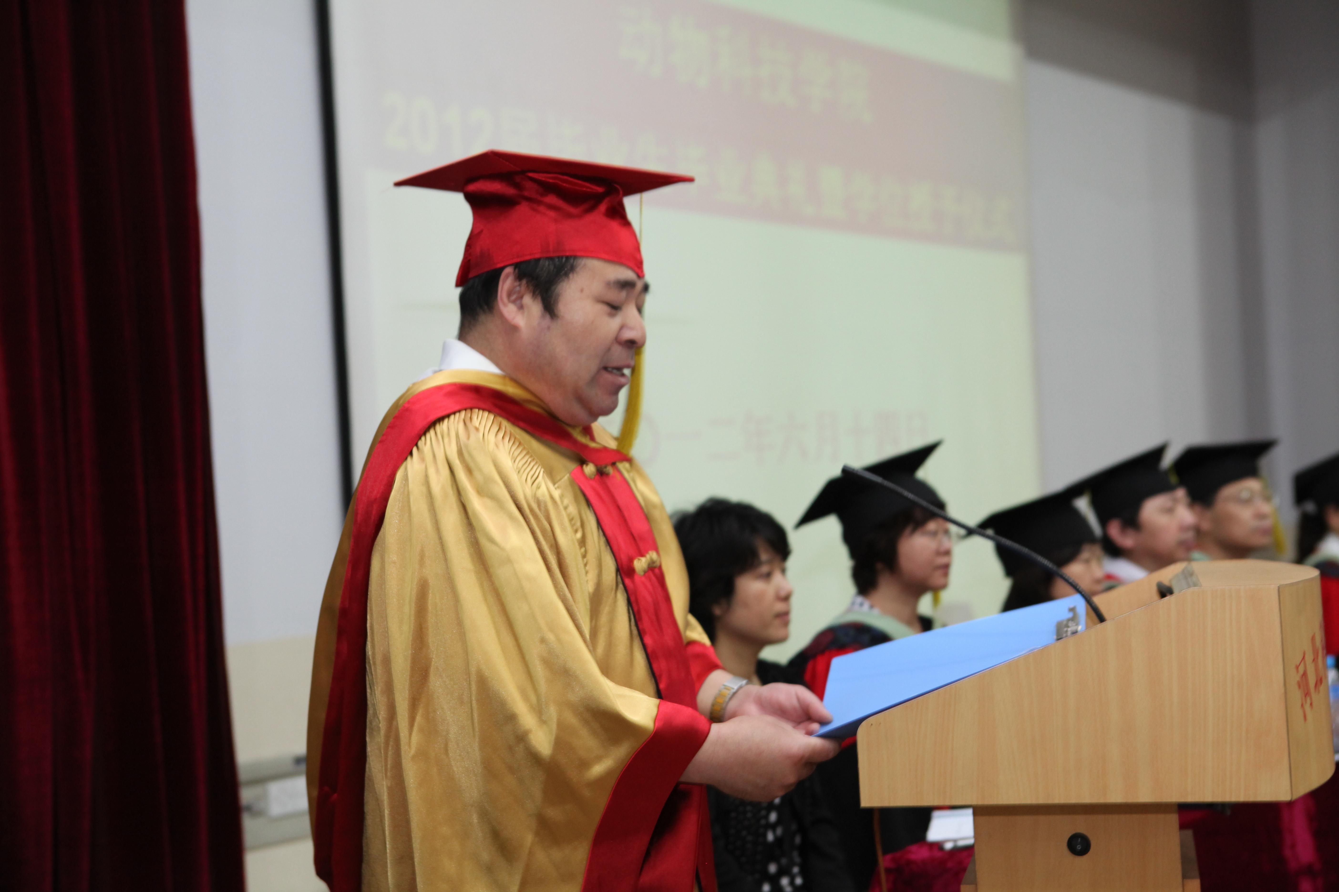 张香斋教授代表指导教师发言,她希望同学们认认真真做事,踏踏实实做人,为母校增光。动物医专业毕业生赵国星同学代表所有学士学位获得者发言,他感谢公司老师的悉心教导,表示将不负母校期待,在新的工作岗位上为国家和社会做出新的更大的贡献。09级动物科学专业曹焱同学代表全院在校生发言,她对即将离开母校的师哥师姐表示美好的祝福。