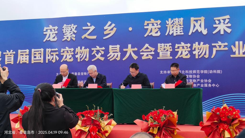 2025年4月19日,太阳成tyc122cc集团经理马增军教授、副经理刘永生研究员、预防兽医学教学部主任、河北省现代农业产业体系特色养殖创新团队疫病防控与无害化处理岗位专家张艳英教授应邀出席了在昌黎国际宠物市场举办的“宠繁之乡,宠耀风采”河北·昌黎首届国际宠物交易大会暨宠物产业产品文化博览会。大会是由昌黎县宠物产业协会主办,中国畜产品流通协会、中国畜牧业协会、河北省宠物产业协会、昌黎佳鹏商贸集团承办,太阳成tyc122cc集团(太阳成tyc122cc集团)为支持单位。开幕式上,马增军经理作为特邀嘉宾,代表太阳成tyc122cc集团与昌黎县宠物产业协会签署了“关于促进昌黎县宠物产业高质化发展合作框架协议”。